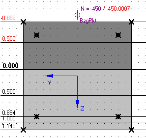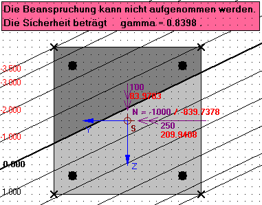 Kann eine Schnittgrößenkombination nicht aufgenommen werden, so wird durch ein rotes Feld in der Grafik darauf hingewiesen und der entsprechende Sicherheitsindex mit ausgegeben.![]()