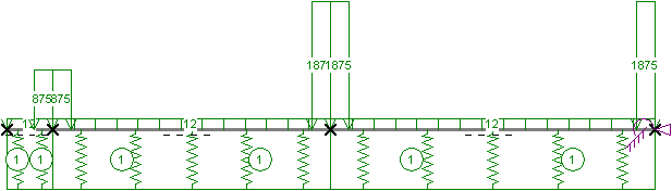 Lastverformungskurve besitzt zu Beginn die gleiche Steifigkeit wie in Rechnung 1 und 2, wird dann jedoch weicher. Werden Nichtlinearitäten sowohl bei der Bettung als auch beim Querschnitt benutzt, gestaltet sich der Iterationsprozess ungleich schiweriger. Aus diesem Grund war es erforderlich, die 6,00 bzw. 7,00 m Balkenabschnitte in jeweils zwei Balken zu unterteilen. In den Ergebnissen sieht man, dass durch den weicher werdenden Boden die Umlagerung wieder in die andere Richtung stattfand. Die Beanspruchungen des Balkens (Biegemoment) sind wieder angestiegen auf M = 431,13 kNm, die Bettungsspannung als Reaktion des Boden ist wieder leicht gefallen auf 442,48 kN/m. Bemerkenswert ist auch, dass im zweiten Balkenabschnitt zwischen 2. und 3. Stütze das Fundament leicht abhebt und die Spannungen in einem Bereich von knapp 0,8 m auf Null gehen (Ausschluss von Zugspannungen). |