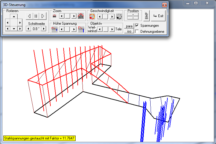 3D-Ansicht der Spannungsverteilung, Beispiel: Schiefe Biegung für vorgespannter Plattenbalken