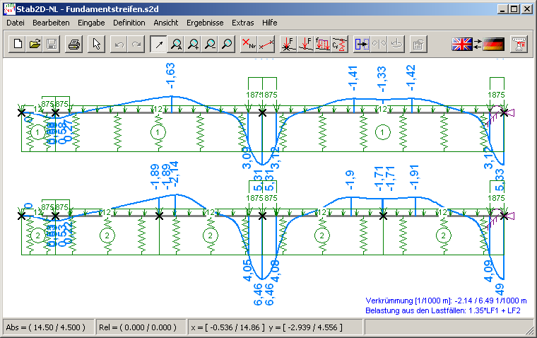 Stahlbetonquerschnitte (nichtlinear) + nichtlineare Bettung. Anzeige der Verkrümmungen.