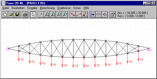 Truss 2D NL ist ein von mir entworfenes PC-Programm und dient der statischen Berechnung einfacher, 2dimensionaler Fachwerke (engl.: truss). Mit dem mittlerweile in Version 2.0 vorliegenden Programm lassen sich geometrische Nichtlinearitäten (wie Snap Through, große Verformungen) berechnen sowie nichtlineares Materialverhalten modellieren.
